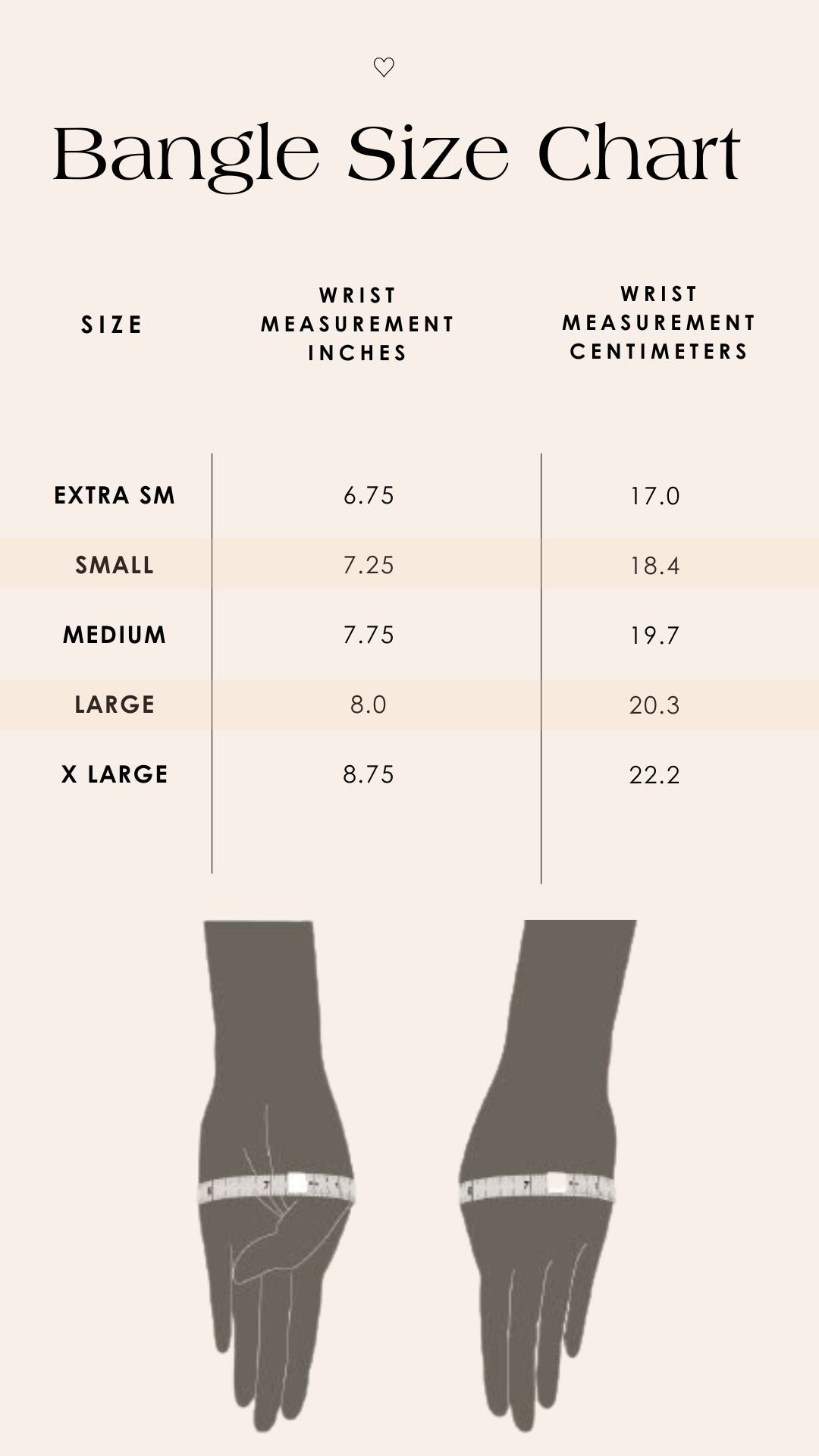 To determine your bangle size, simply tuck your thumb into the palm of your hand (as if about to put on a bangle) and using tailor’s tape, measure your hand all the way around the set of knuckles closest to your wrist, from knuckle to knuckle.